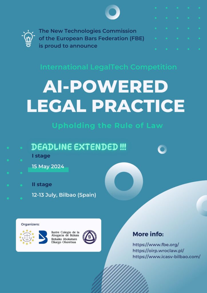 w imieniu Federacji Adwokatur Europejskich (FBE) pozwalam sobie przekazać, że do 15 maja 2024 r. przedłużony został nabór zgłoszeń w tegorocznej edycji International LegalTech Competition – międzynarodowego konkursu organizowanego przez FBE celem rozwijania innowacji na styku prawa i sztucznej inteligencji w sposób zgodny z wymogami praworządności.